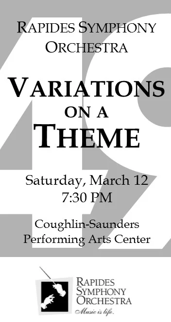 Join the Rapides Symphony Orchestra on Saturday, March 12 for Variations on a Theme, a concert featuring music by Edward Elgar and Alberto Ginastera. The highlight of the evening, Elgar’s Enigma Variations is another major work by this British composer best-known for his Pomp and Circumstance Marches. In his Enigma Variations, Elgar depicts friends and colleagues through a series of variations on an elusive theme. Also on the program is Argentine composer Ginastera’s Variaciones concertantes which highlights a different instrument or instruments in each of its subsequent variations.